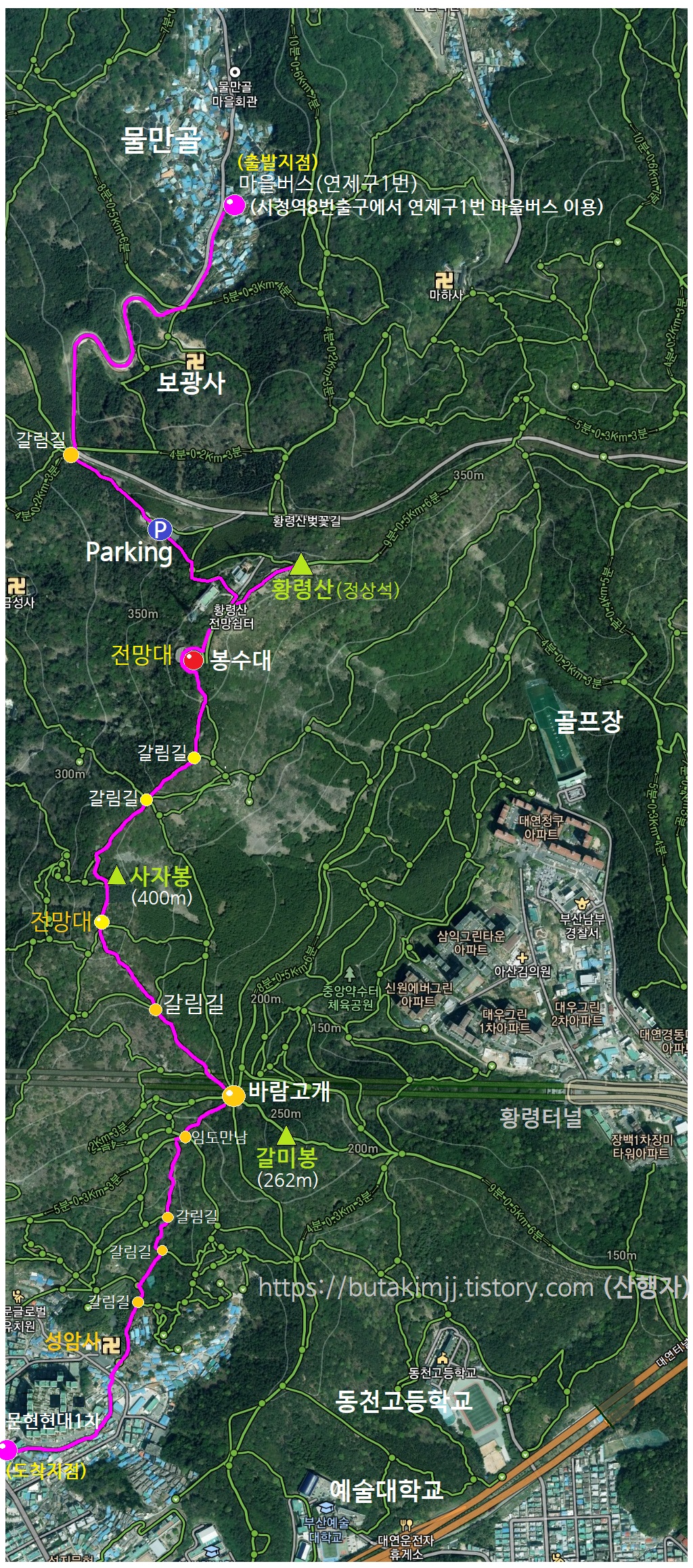▩ 산행코스 : 시청역(8번출구)→연제1번마을버스→물만골→포장도로→휴게광장→황령산(427m,정상석)→봉수대(전망대)→사자봉(400m)→바람고개→문현현대아파트1차